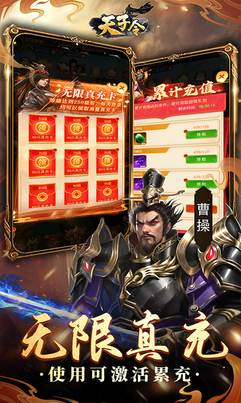 0.1折三国放置卡牌《天子令》震撼来袭!全场充值仅需0.1折!礼包低至1分钱!内置无限送真充卡,更有免费千抽,抽到满意阵容为止,不充值也能轻松畅玩!游戏还原经典三国历史,策略性再创新玩法,融合回合制卡牌和放置挂机机制,构造全新开放自由的三国世界。宏大的五大神兽系统,驯服上古神兽助你驰骋三国;海量高策略性武将阵容搭配,不死板,不单调,全武将星级无损耗重置换将,让你轻松自在打造超强阵容;全新军团联盟玩法,化身联盟精英,与各路诸侯逐鹿中原,谁与争锋!解放双手,轻轻松松成就三国英雄梦,不肝不氪,畅玩三国。