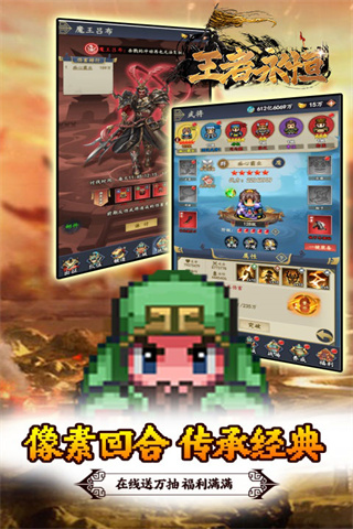 游戏深度传承经典回合制玩法,并在此基础上进行大胆创新,为你呈现一个战火纷飞、热血激昂的战场。 在这个机遇与危机四伏的时代,你最初只是籍籍无名的小人物,从汉中之战拉开序幕,于战场上奋勇拼杀,不断累积赫赫战功。同时,广纳四方豪杰,与他们并肩作战,一同纵横天下。无论是运用精妙的谋略排兵布阵,还是亲自冲锋陷阵奋勇杀敌,你都有机会成长为称霸一方、号令天下的霸主。 游戏中,数十种风格迥异、特点鲜明的武将技能,搭配琳琅满目的宝物装备,为你的战斗策略带来无穷无尽的变化和想象空间。每一场战斗,都是智慧与勇气的激烈交锋;每一次决策,都可能改变你霸业征途的走向。