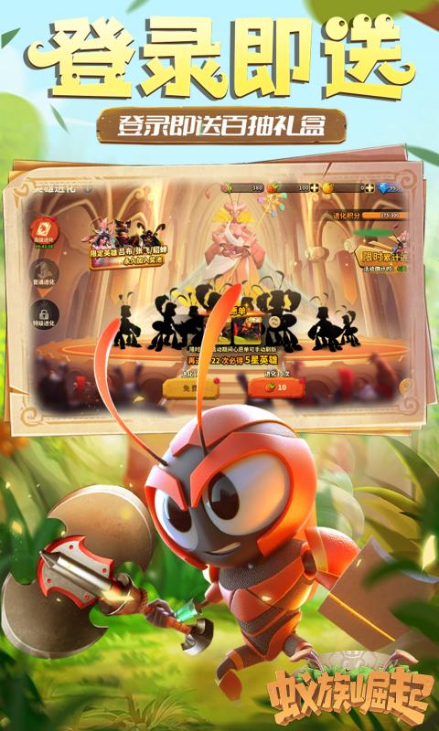 在《蚁族崛起》你将作为蚁族统帅,建造你的专属蚂蚁王国。神机妙算的三国英雄、智勇双全的凯撒,还有数位出类拔萃的豪将,都等待你招募入队,成为蚁族中坚!通过资源囤积、城防修建、战力提升,将一方蚁穴壮大成为兵「蚁」强壮的王国城邦!与百万玩家结盟或是为敌,抵御强敌进攻,联手攻克城池,战无不胜,攻无不取,成为地下世界的霸主!