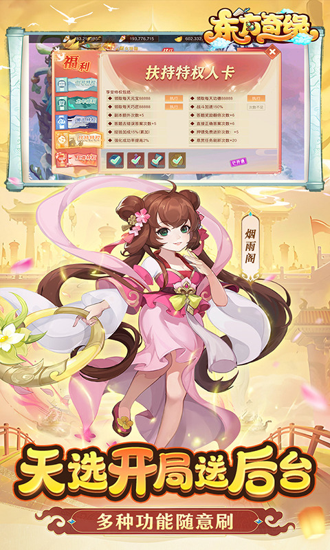一款3D自由飞行仙侠手游,精品画面品质,超酷炫的套装幻化,每日仙神妖魔多界混战,强力BOSS首领爆限量极品,多区服赛季对战争夺王座,进游永久享受所有充值档位打0.1折,即充值648只需要6.48元!升级即送真充卡激活线上充值活动,日常打怪红装、幻化爆不停。